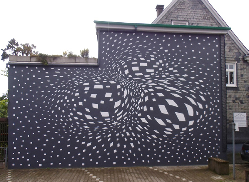Zemans Intention war es eine Arbeit zu kreieren, die die formalen Aspekte der Umgebung aufgreift und durch seine Interpretation einen neuen Blickwinkel auf die Umgebung entwickelt. "in motion" zeigt eine Vielzahl von aufgemalten Elementen, die in ihrer Grundform an bergische Schieferplatten erinnern, die die anderen Fronten des Hauses und die Häuserfassaden in der Umgebung verkleiden. Auf schiefergrauem Grund scheinen die weißen Elemente in Bewegung zu geraten und den Raum zu dynamisieren.